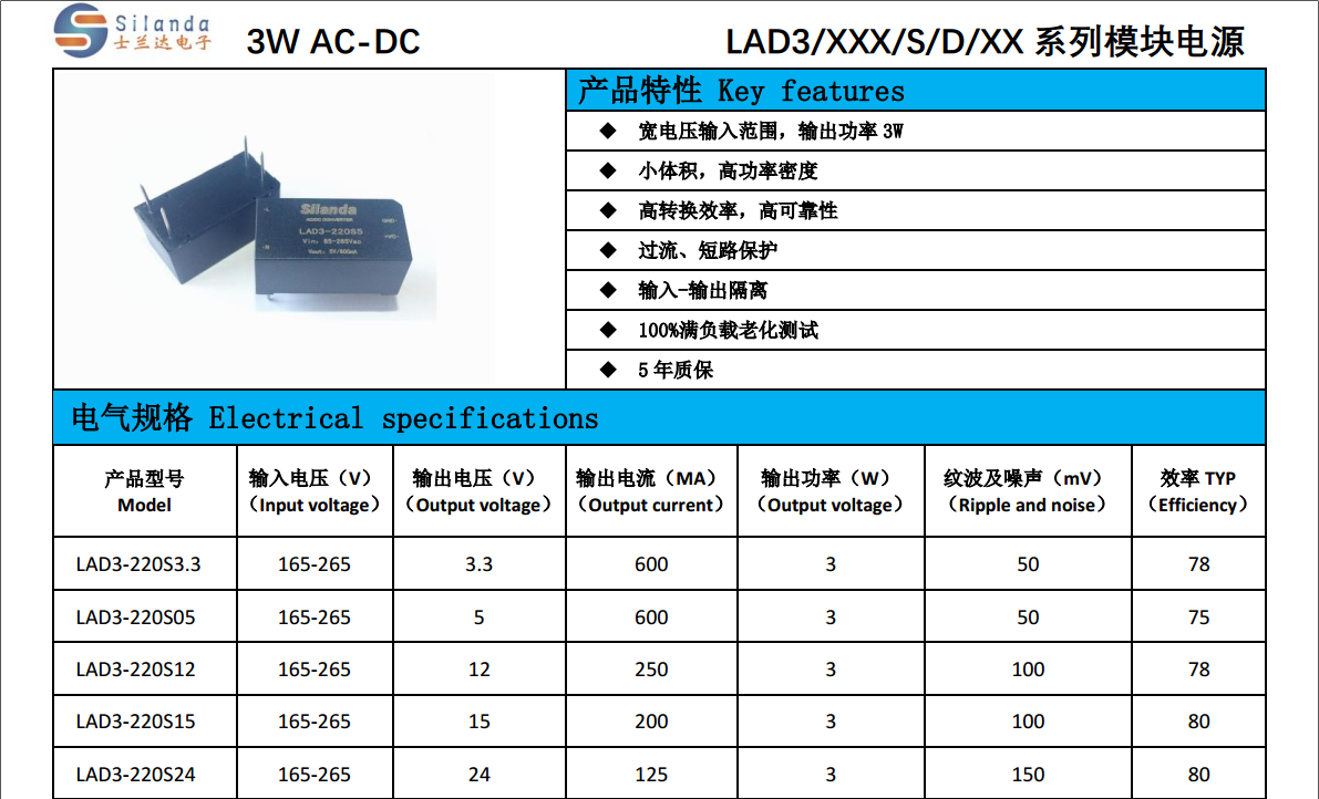 寬電(diàn)壓輸入範圍,輸出功率3W 小(xiǎo)體(tǐ)積,高(gāo)功率密度 高(gāo)轉換效率,高(gāo)可(kě)靠性 過流、短(duǎn)路(lù)保護 輸入-輸出隔離(lí) 100%滿負載老(lǎo)化(huà)測試 5年(nián)質保