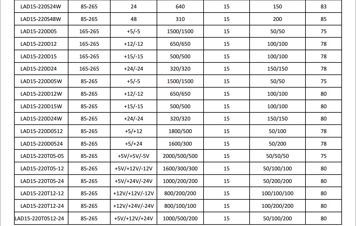 寬電(diàn)壓輸入範圍,輸出功率15W 小(xiǎo)體(tǐ)積,高(gāo)功率密度 高(gāo)轉換效率,高(gāo)可(kě)靠性 過流、短(duǎn)路(lù)保護 輸入-輸出隔離(lí) 100%滿負載老(lǎo)化(huà)測試 5年(nián)質保
