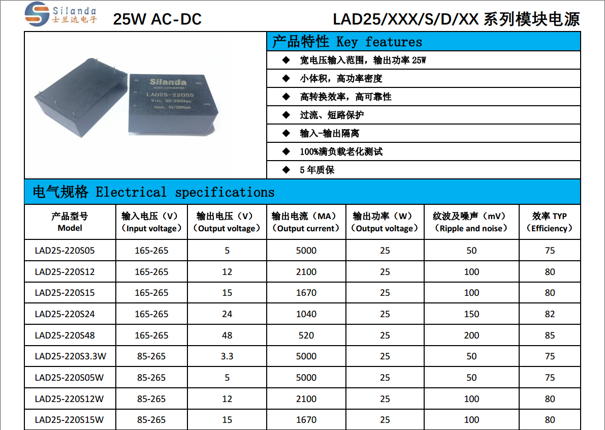 寬電(diàn)壓輸入範圍,輸出功率25W 小(xiǎo)體(tǐ)積,高(gāo)功率密度 高(gāo)轉換效率,高(gāo)可(kě)靠性 過流、短(duǎn)路(lù)保護 輸入-輸出隔離(lí) 100%滿負載老(lǎo)化(huà)測試 5年(nián)質保