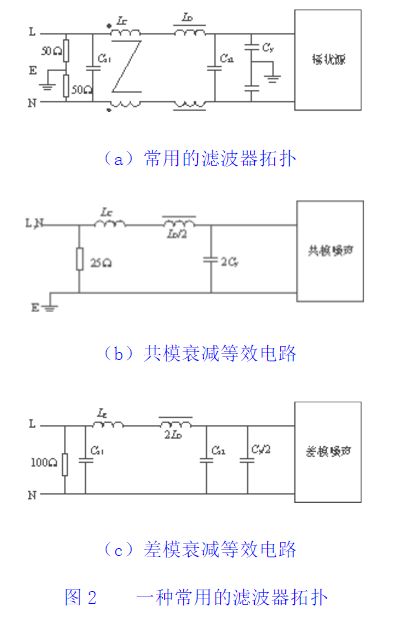 以一(yī)種常用(yòng)的(de)濾©∑波器(qì)拓撲〔圖2(a)〕為(wèi)例,分(fēn)别對(β©φεduì)共模、差模噪聲濾波器(qì)等效電(diàn)路(lù)進行π ♥>(xíng)分(fēn)析。圖2(b)及圖2(c)分(fēn)别代表濾波器(₽§qì)共模衰減和(hé)差模衰減等效電(diàn)路(lùσ✔↕)。分(fēn)析電(diàn)路(lù)可(k≠♥¶•ě)知(zhī),Cx1和(hé)Cx2隻用(yòng)于抑制(zφ↑∑hì)差模噪聲,理(lǐ)想的(de)共模扼流電(diàn)感•αLC隻用(yòng)于抑制(zhì)共模噪聲。但(dàn)是(shì☆€σ★),由于實際的(de)LC繞制(zhì)的(de)不(♠$'bù)對(duì)稱,在兩組LC之間(jiā∑♥÷ n)存在有(yǒu)漏感Lg也(yě)可(kě)用(yòng)于抑制(zh® ™ì)差模噪聲。Cy即可(kě)抑制(zhì)共模幹擾、又(yòu)"÷♥可(kě)抑制(zhì)差模噪聲,隻是(shì)由于差模抑制(×✔♠zhì)電(diàn)容Cx2遠(yuǎn)大(dà)于Cy,Cy對↓↓≈(duì)差模抑制(zhì)可(kě)忽Ω"≥↓略不(bù)計(jì)。同樣,LD既可(k∑↑↔ě)抑制(zhì)共模幹擾、又(yòu)可(•π∏kě)抑制(zhì)差模幹擾,但(dàn)LD遠(yuǎn γε±)小(xiǎo)于LC,因而對(duì)共模噪聲抑制(z≥Ωhì)作(zuò)用(yòng)也(yě)相(₩$☆xiàng)對(duì)很(hěn)小(xiǎo)。¶®≤"