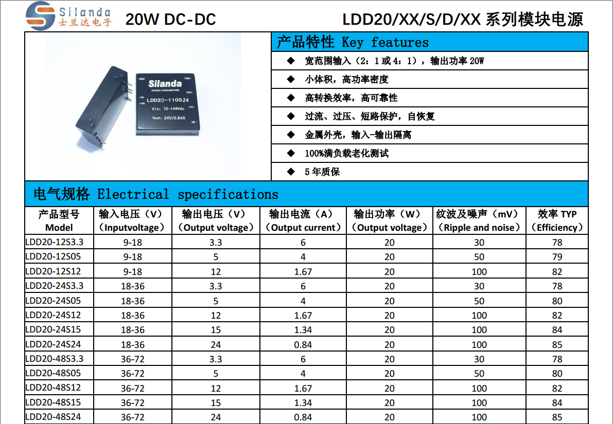 寬範圍輸入(2:1或4:1),輸出功率5W 小(xiǎo)體(tǐ)積,高(gāo)功率密度 高(gāo)轉換效率,高(gāo)可(kě)靠性 過流、過壓、短(duǎn)路(lù)保護,自(zìα<£₽)恢複 金(jīn)屬外(wài)殼,輸入-輸出隔離(∑→lí) 100%滿負載老(lǎo)化(huà)測試 5年(nián)質保