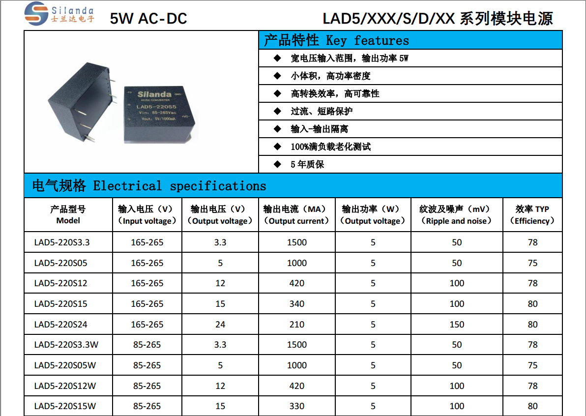 寬電(diàn)壓輸入範圍,輸出功率5W 小(xiǎo)體(tǐ)積,高(gāo)"'€÷功率密度 高(gāo)轉換效率,高(gāo)可(kě)靠性 過流、短(duǎn)路(lù)保護 輸入-輸出隔離(lí) 100%滿負載老(lǎo)化(huà)測試 5年(nián)質保