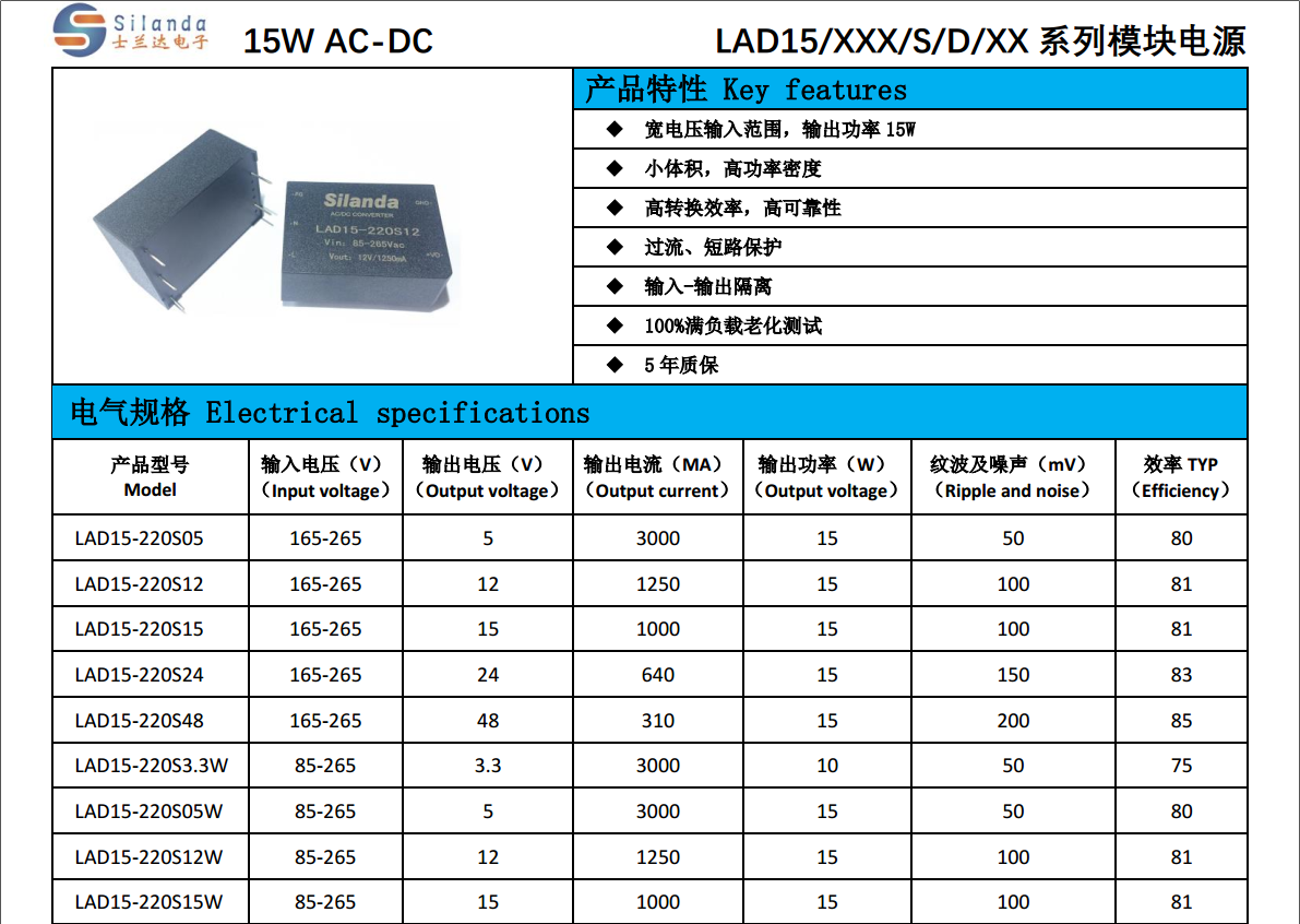 寬電(diàn)壓輸入範圍,輸出功率15W 小(xiǎo)體(tǐ)積,高(gāo)功率密度 高(gāo)轉換效率,高(gāo)可(kě)靠性 過流、短(duǎn)路(lù)保護 輸入-輸出隔離(lí) 100%滿負載老(lǎo)化(huà)測試 5年(nián)質保